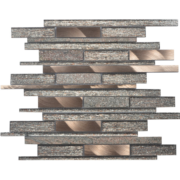 Warm, luxurious, and richly textured the Linear 8mm Copper Graphite Mosaic brings together brushed copper metal, sparkling textured glass, and natural stone. The combination creates a standout feature perfect for sophisticated kitchens, bar areas, and modern bathrooms.