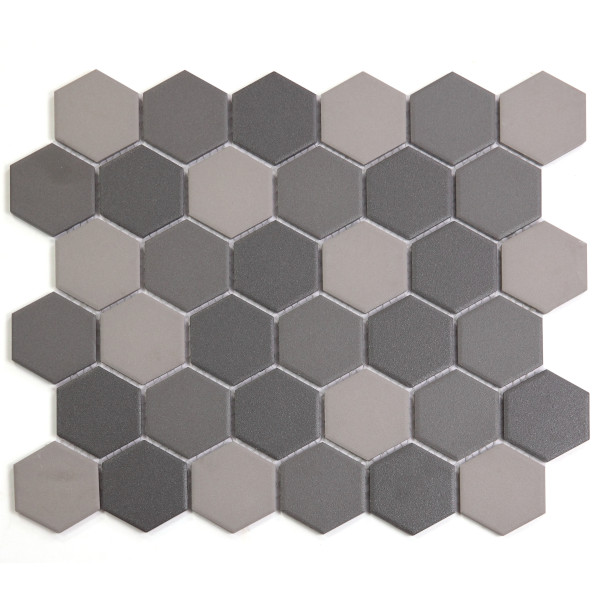 The Mixed Hexagon Dark Matt mosaic features a striking blend of charcoal, graphite, and mid-grey hexagonal chips, bringing depth and contemporary elegance to modern interiors. Each 51 × 59mm porcelain chip is finished in a refined matt glaze, offering both durability and visual sophistication.